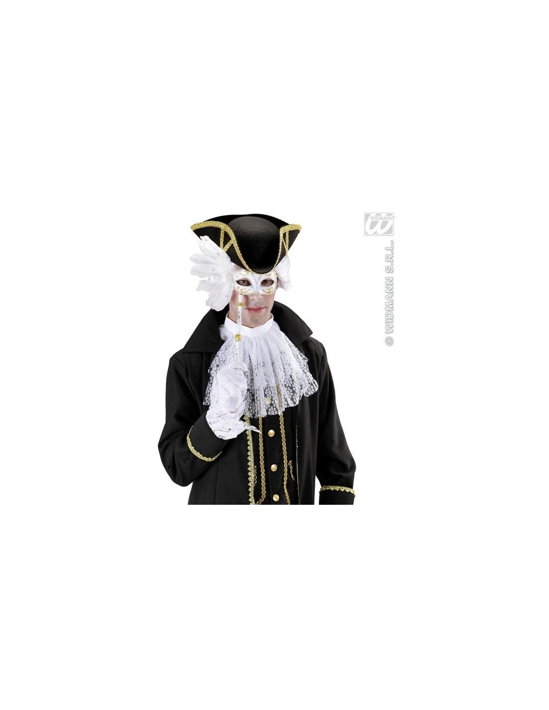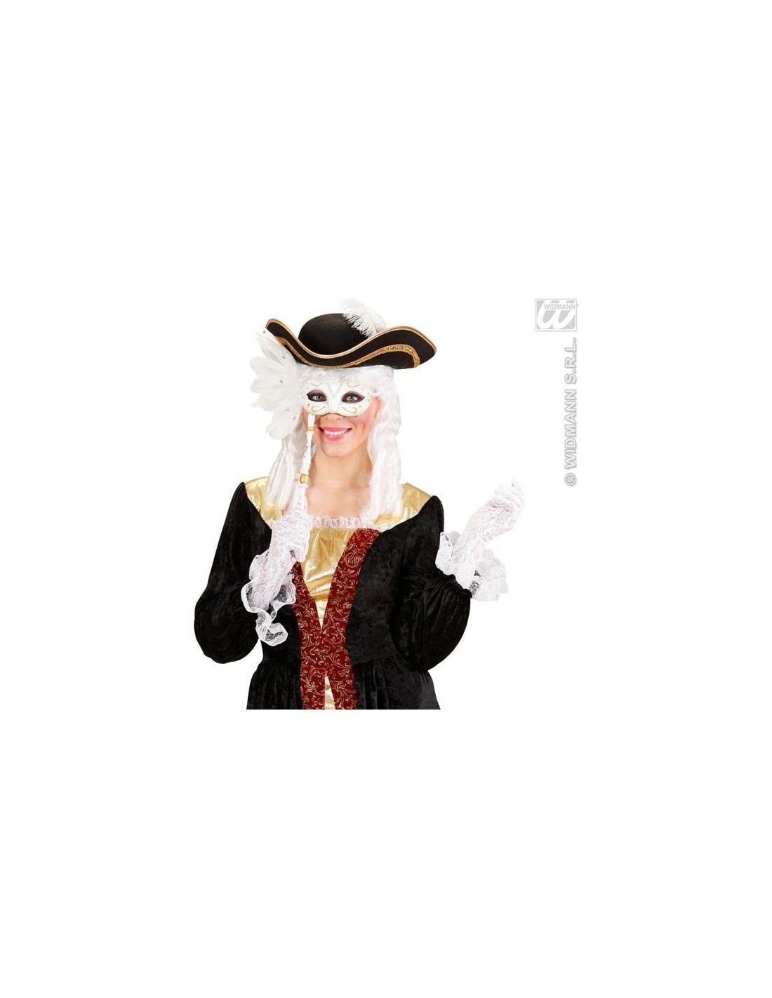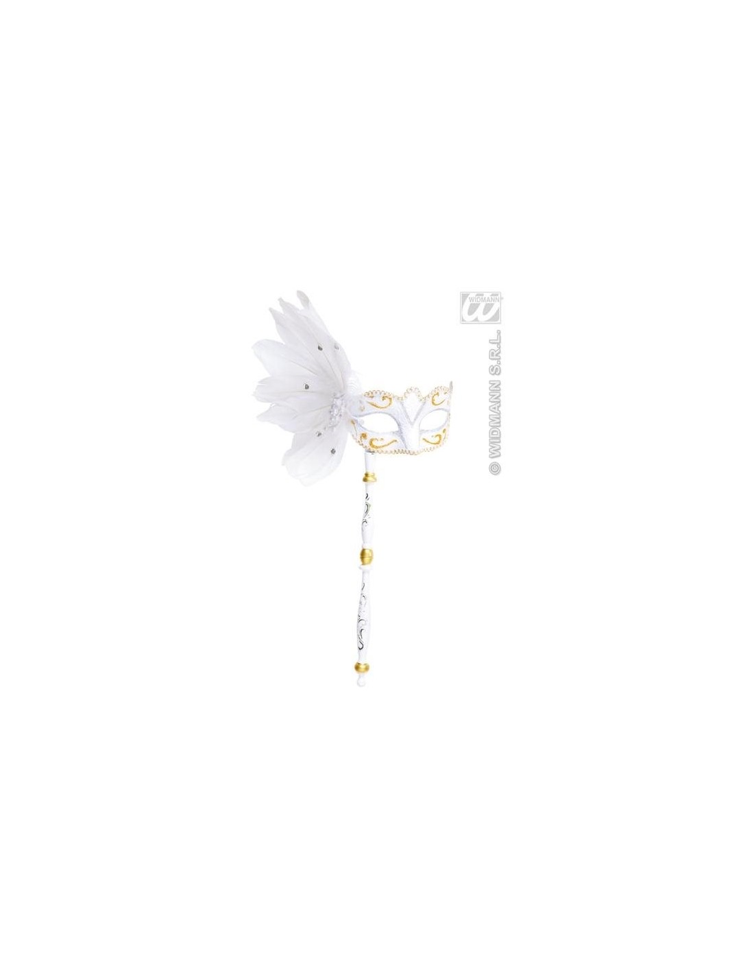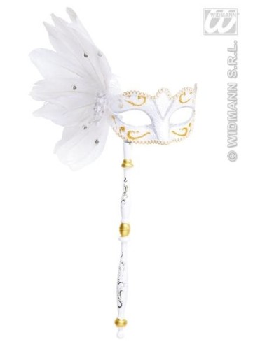 ANTIFAZ BLANCO CON VARILLA, PLUMAS Y DECORACIONES PLATA/ORO