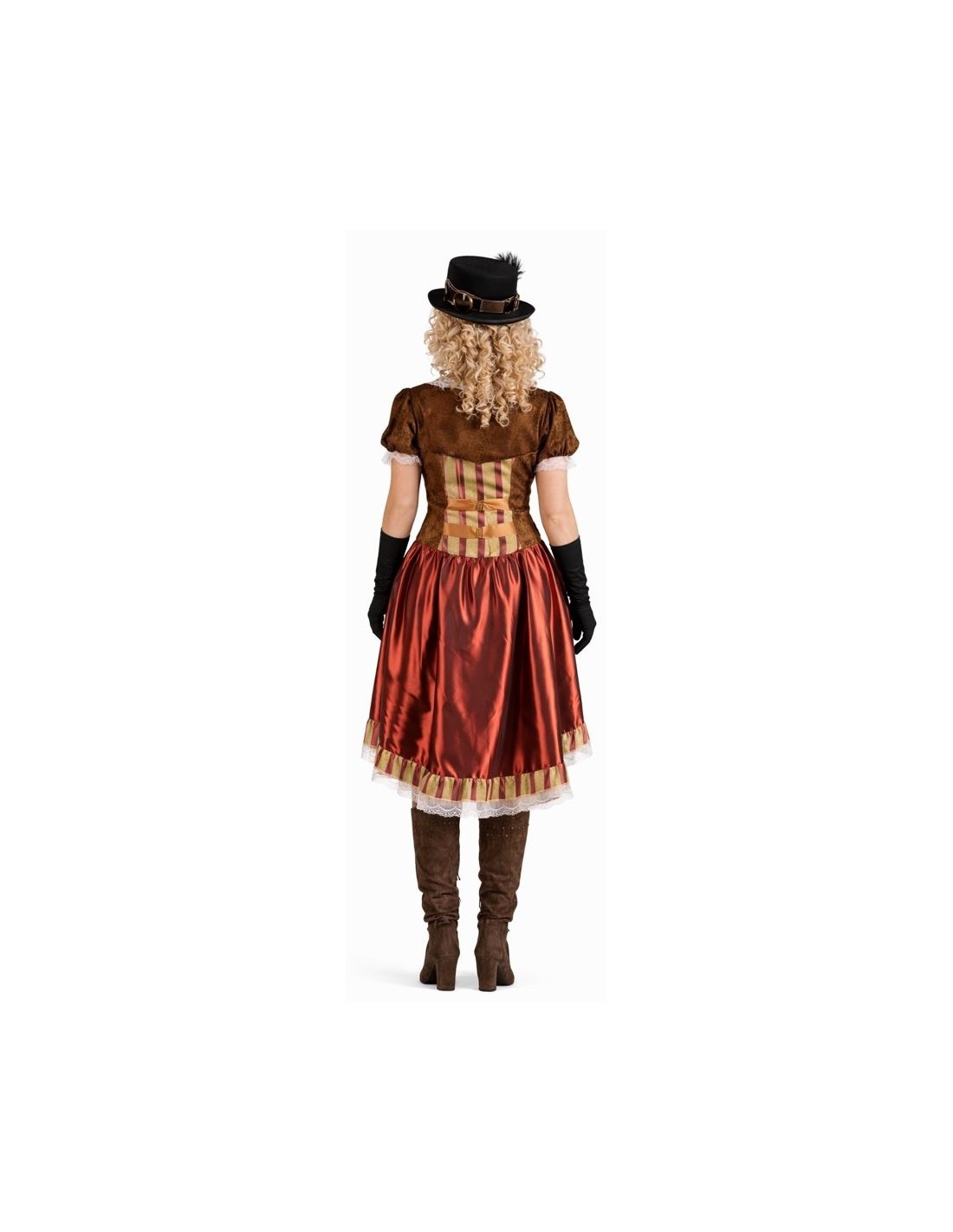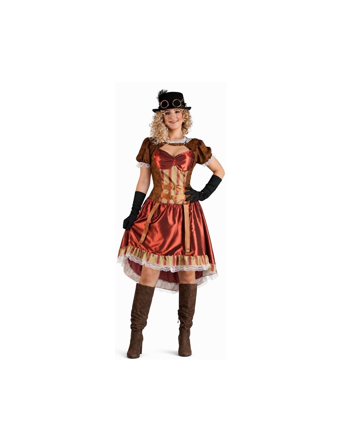 disfraz Steampunk con vestido de silueta en A y bajo asimétrico, más largo por detrás, que combina telas de gran contraste para un efecto impactante. El escote corazón con frunce central realza el busto, mientras el cuello cerrado con velcro, decorado con encaje y botón dorado, añade un aire victoriano. Mangas y laterales en tejido de tacto melocotón se fusionan con una falda de raso color vino, de apariencia tafetán, adornada con encaje y fruncido lateral para dar vuelo. La cintura con elásticos y la espalda en punto semielástico garantizan comodidad, mientras los detalles en poliéster estructurado imitan correas de cuero, aportando el auténtico estilo steampunk.