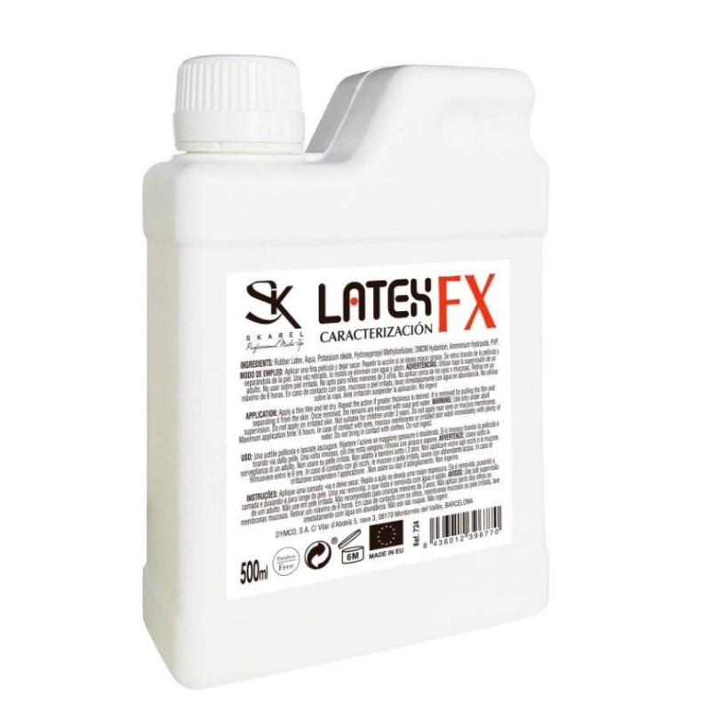 El Látex Skarel es un líquido blanco que se utiliza en la caracterización. Su especial secado, que convierte el látex aplicado en la piel en una película fina transparente y brillante.