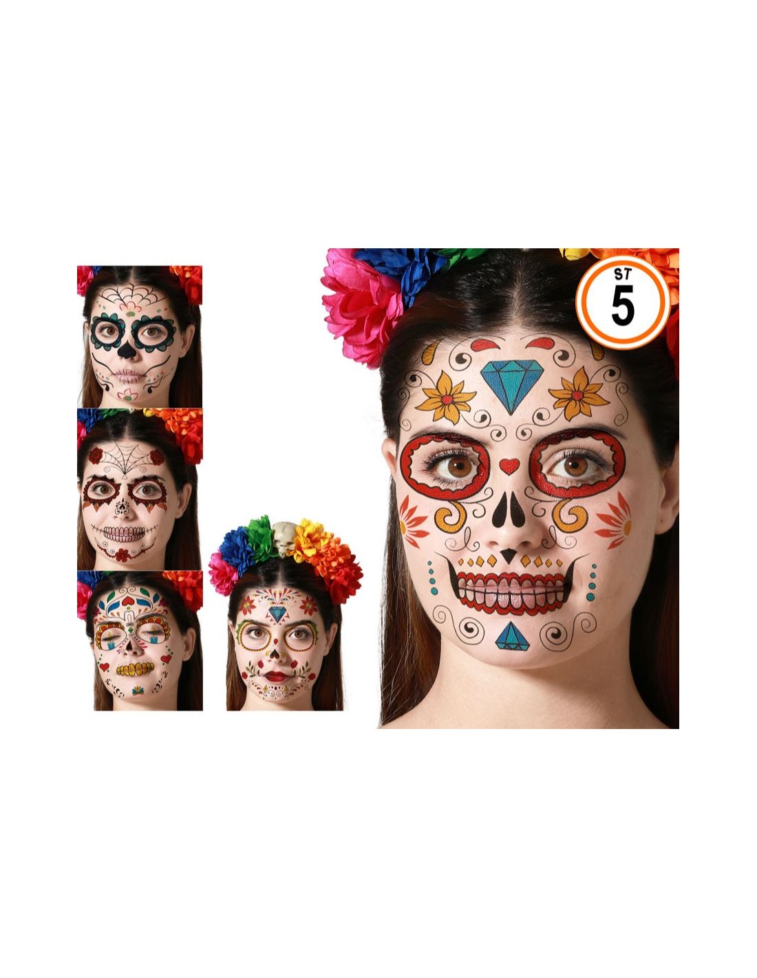 tatuajes para rostro inspirados en calaveras decoradas. Colores vivos y detalles florales y geométricos.