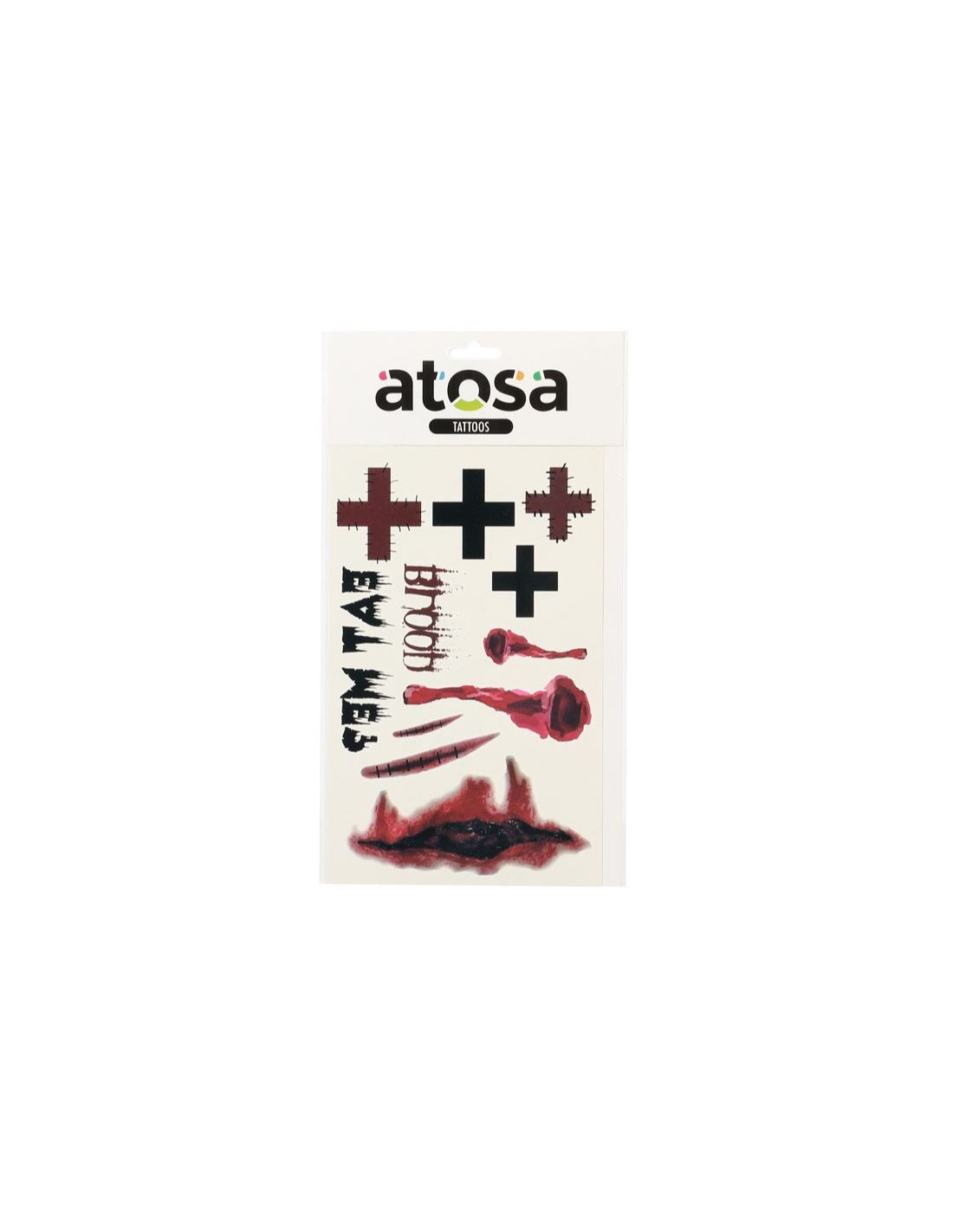 Conjunto de tatuajes temporales que incluyen cortes sangrientos, puntos de sutura y arañazos. Ideal para disfraces de monstruo o víctima de horror.