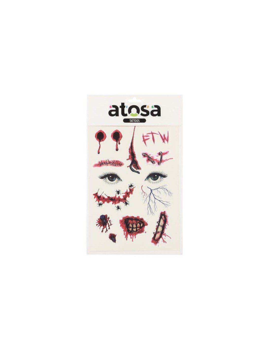 tatuajes con efectos de heridas, símbolos satánicos y marcas sangrientas. Ideal para disfraces de zombie, bruja, demonio o víctima de terror.