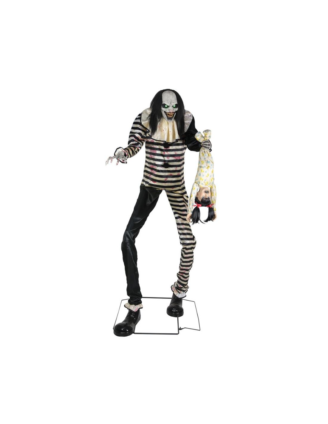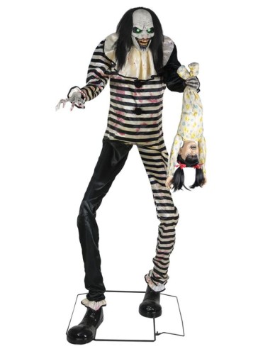 Figura animada que se alimenta por la red eléctrica. Ojos iluminados y mandíbula móvil. La figura se mueve de lado a lado sacudiendo al niño que grita. Funciones de la caja de control: Volumen, sensor infrarrojo, encendido, apagado y teclado (no incluido).