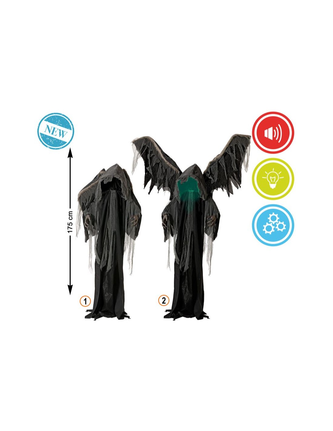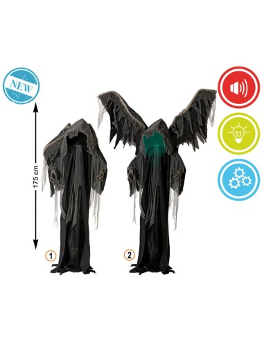 Decoración animada de 175 cm con túnica negra, alas gigantes articuladas y rostro oculto en penumbra. Ideal para entradas y escenarios de ultratumba.