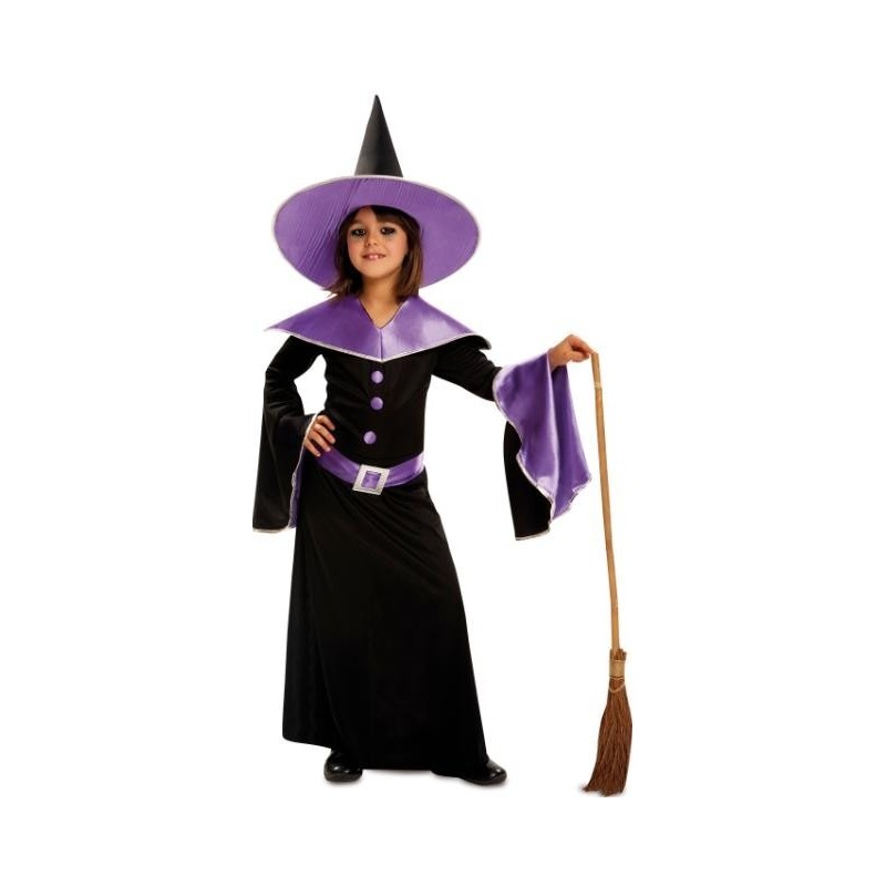 Disfraz de Bruja morada para niña. Contiene: Vestido, cinturón y sombrero No incluye escoba